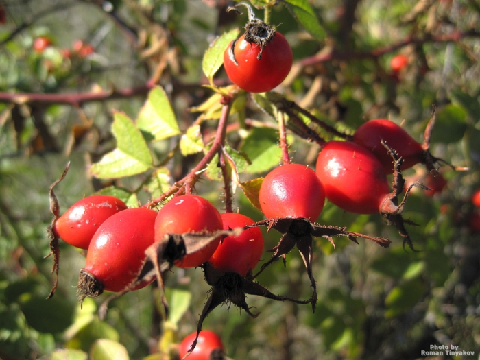 Красивые округлые плоды шиповника бывают оранжевого или красного цвета. А плоды отдельных видов этого растения окрашены в темно-фиолетовый, черный цвет.